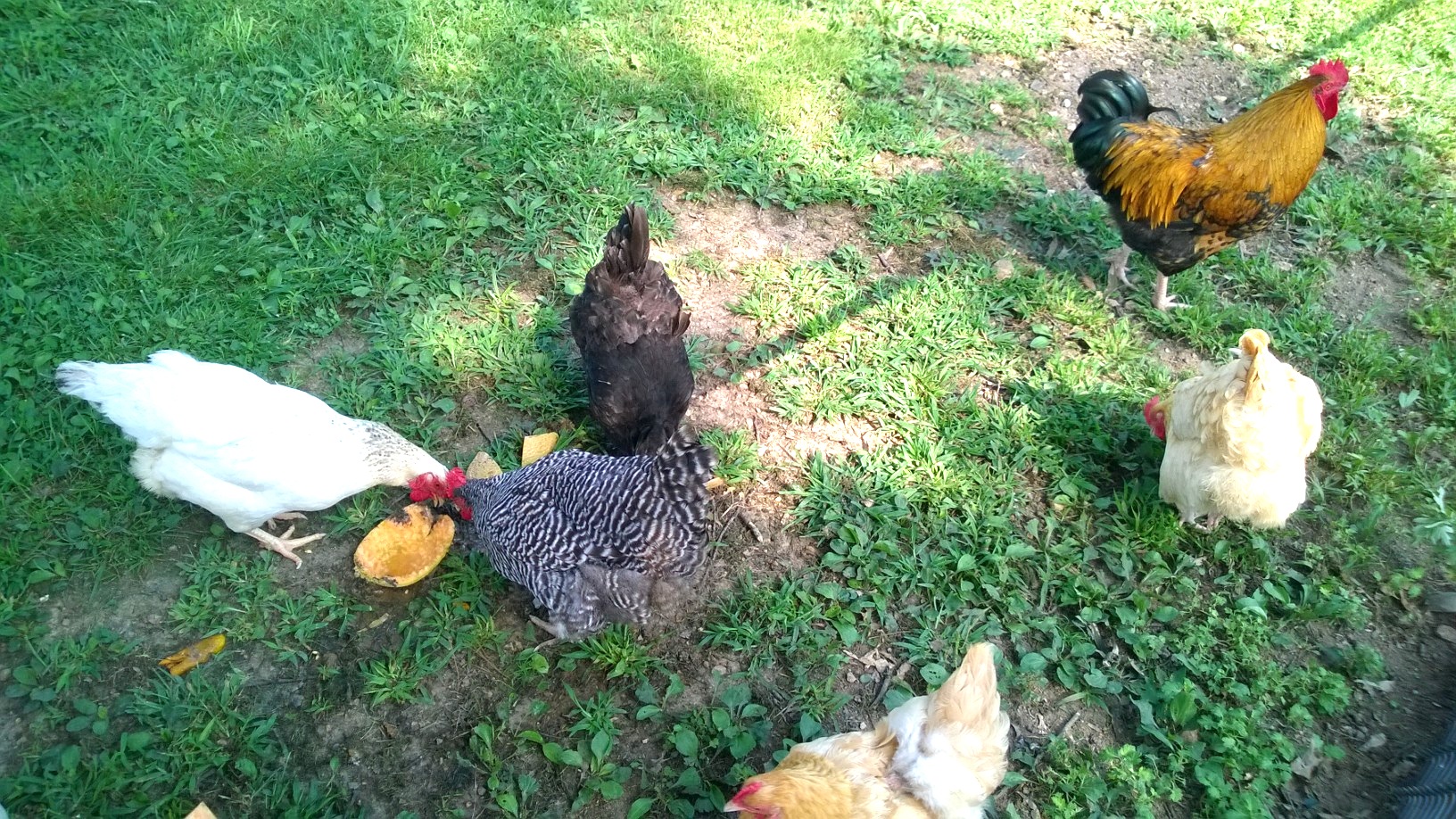 It took roughly four melons to fill up almost all nine shelves in my machine.  I did have a little bit of loss due to some soft spots and cracks.  Recent heavy rains made some of the cantaloupes swell rapidly and crack open.  I was careful to excise any questionable spots.  But even the scraps, soft spots, seeds, and pulp (i call them the “guts”) are consumable … in the chicken yard.  I simply take them out back and toss them to my ridiculously pampered and spoiled hens.  Even my rooster, Abraham, got in on the action!  But the key for a country tightwad is that absolutely nothing goes to waste.  All livestock-edible waste gets converted into tasty eggs.  The skins and peels go right into the compost bin.